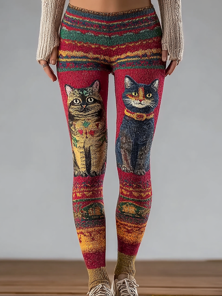 Retro Cat Pattern Women's Knitted Tight-fitting Leggings