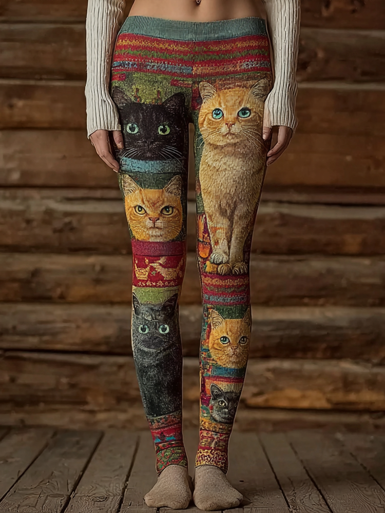Retro Cat Print Women's Tight Knit Leggings