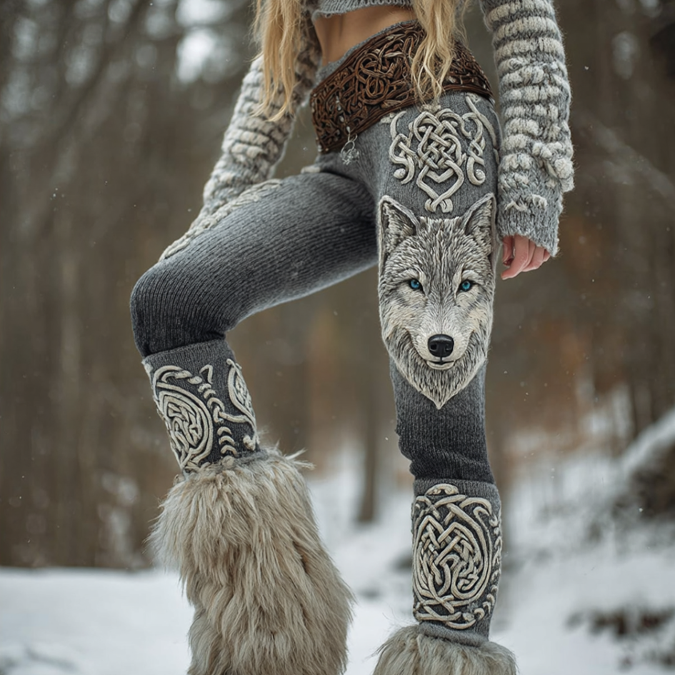 Snow Wolf Retro Viking Style Celtic Knot Women's Knitted Leggings