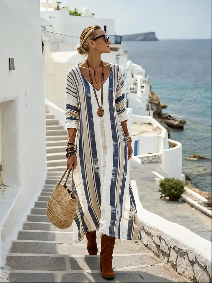 Women'S Casual V-Neck Color-Block Printed Long-Sleeved Dress