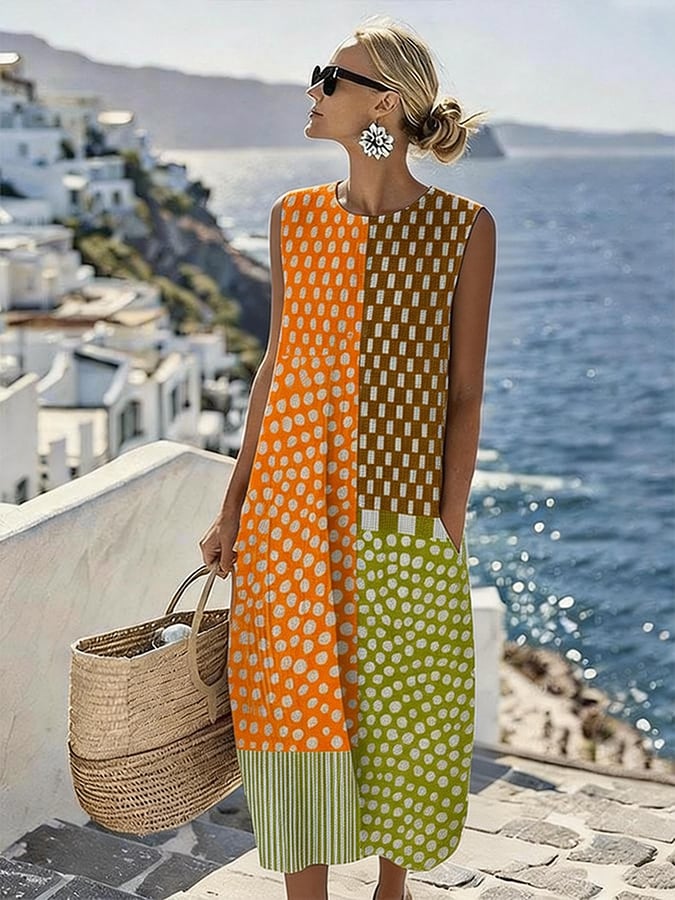 Women'S Round Neck Sleeveless Color-Block Printed Dress
