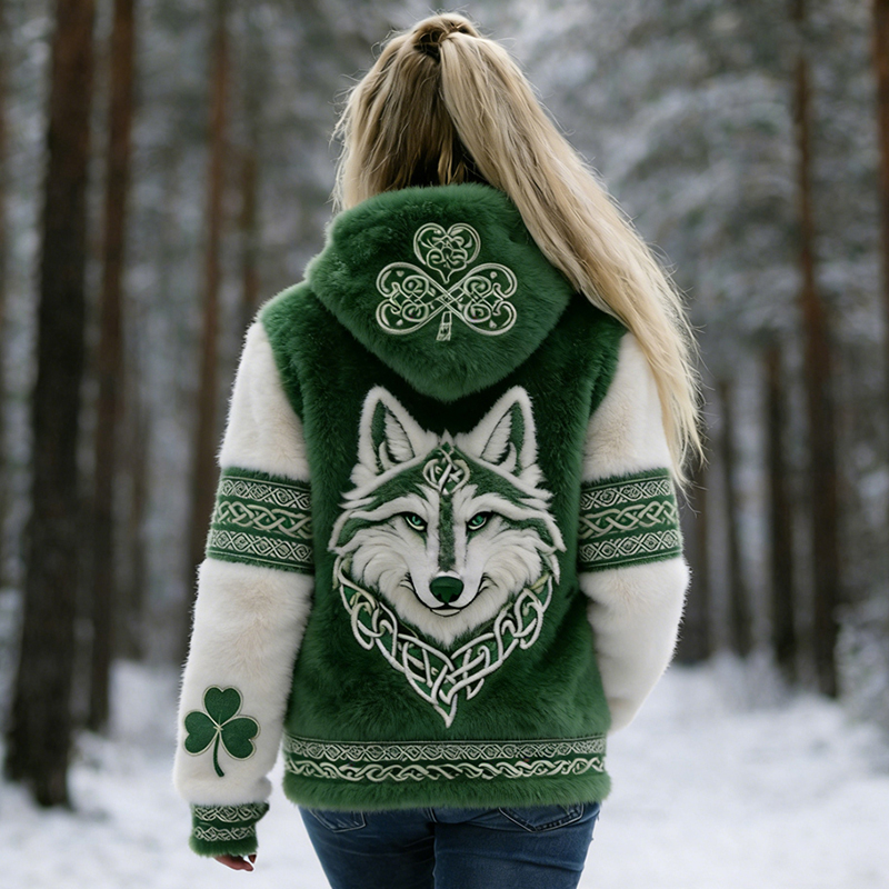 Women's St. Patrick's Day Clover With Wolf Print Zipper Flannel Hoodie