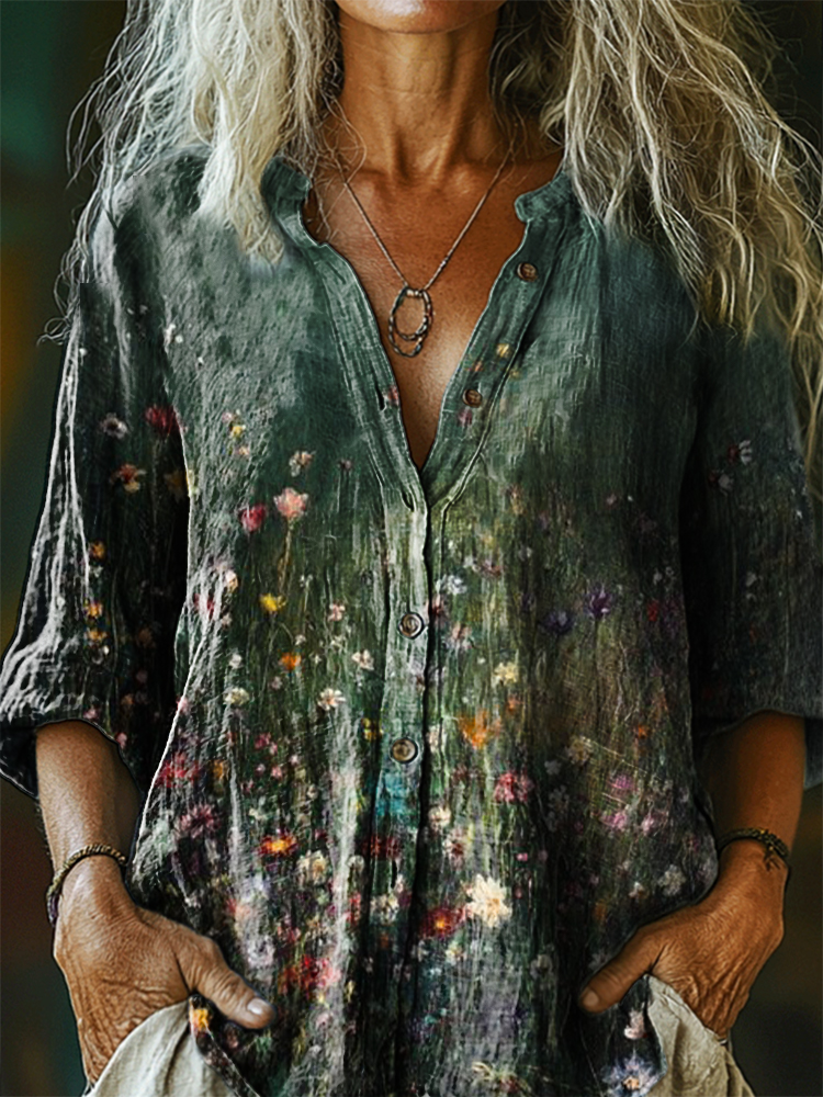 Women's Vintage Floral Art Print Casual Cotton Linen Shirt